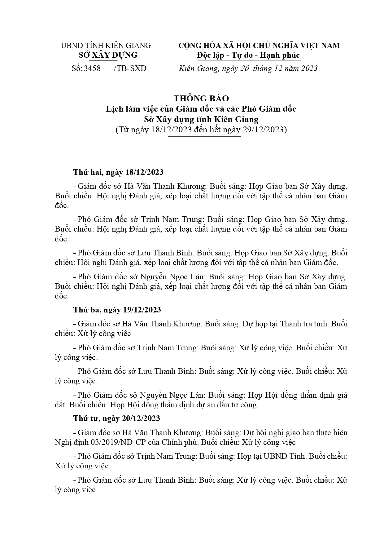 Lịch làm việc của Ban Giám đốc Sở Xây dựng Kiên Giang, 15 ngày cuối tháng 12/2023