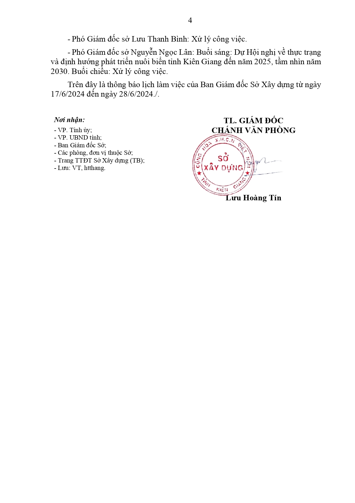 Sở Xây dựng tỉnh Kiên Giang thông báo lịch làm việc của Giám đốc và các Phó Giám đốc Sở Xây dựng tỉnh Kiên Giang, từ ngày 17/6 đến ngày 28/6/2024.