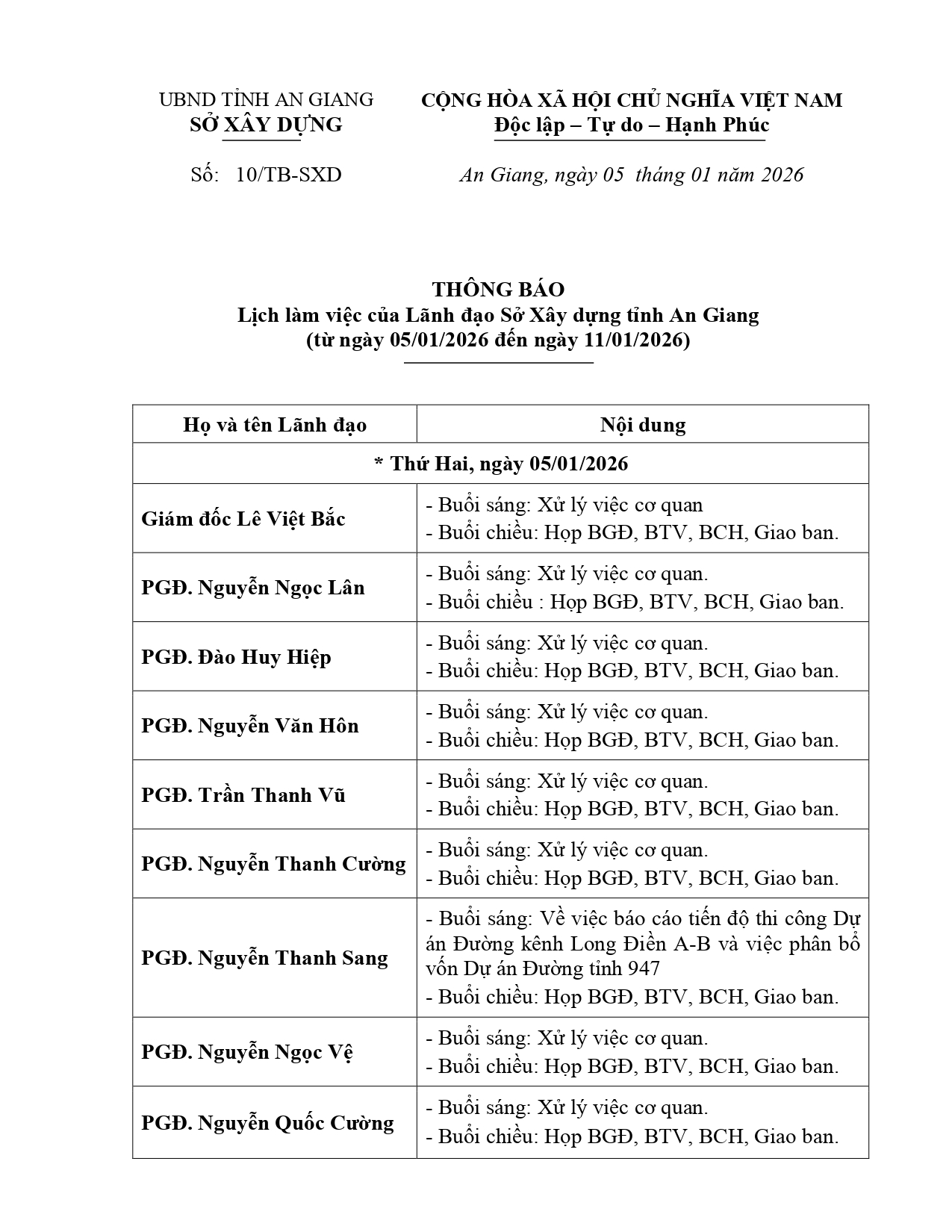 Thông báo số 10/TB-SXD ngày 05/01/2026 của Sở Xây dựng tỉnh An Giang lịch làm việc của Lãnh đạo Sở Xây dựng tỉnh An Giang (từ ngày 05/01/2026 đến ngày 11/01/2026).