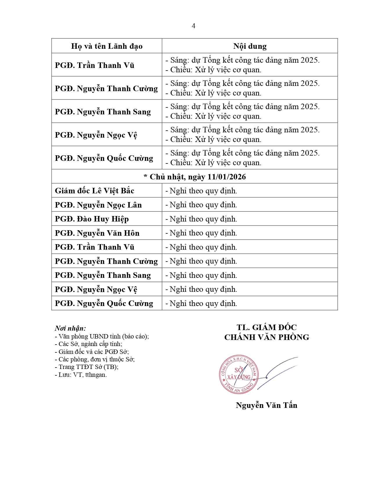 Lịch làm việc của Lãnh đạo Sở Xây dựng tỉnh An Giang, từ ngày 05/01/2026 đến ngày 11/01/2026
