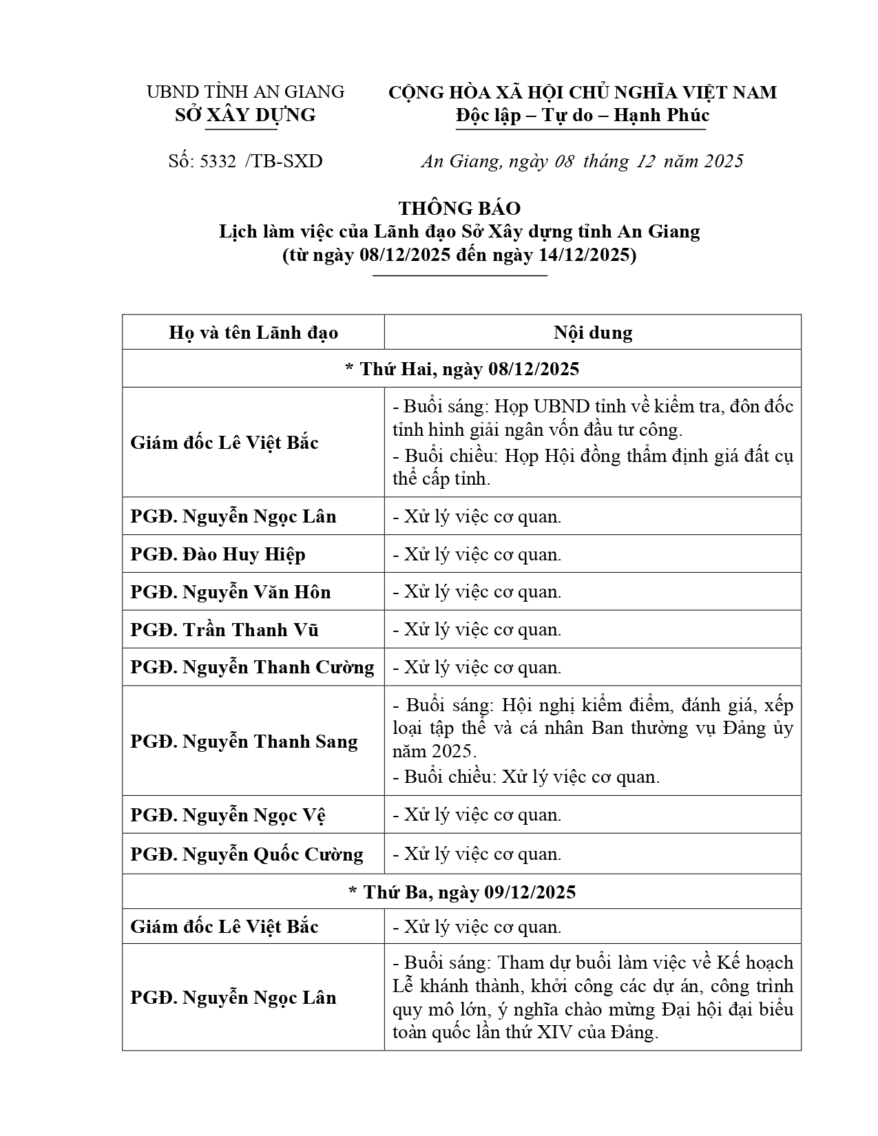 Thông báo số 5332/TB-SXD ngày 08/12/2025 của Sở Xây dựng tỉnh An Giang lịch làm việc của Lãnh đạo Sở Xây dựng tỉnh An Giang (từ ngày 08/12/2025 đến ngày 14/12/2025).