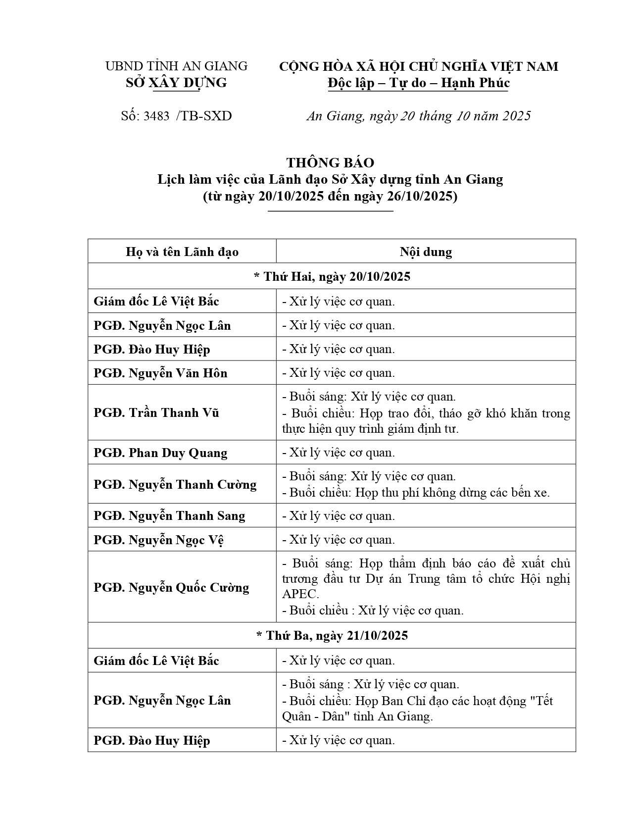 Thông báo số 3483/TB-SXD ngày 20/10/2025 của Sở Xây dựng tỉnh An Giang lịch làm việc của Lãnh đạo Sở Xây dựng tỉnh An Giang (từ ngày 20/10/2025 đến ngày 26/10/2025).
