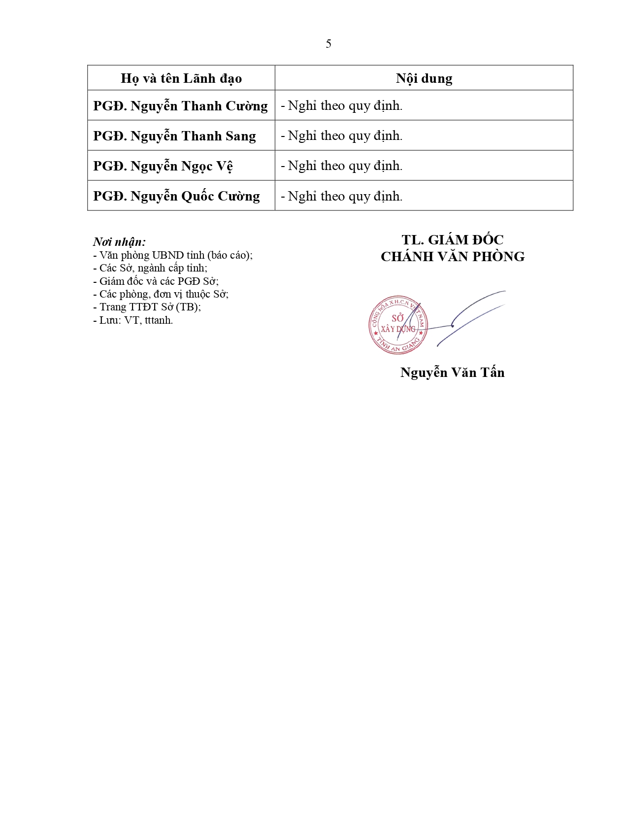 Lịch làm việc của Lãnh đạo Sở Xây dựng tỉnh An Giang, từ ngày 24/11/2025 đến ngày 30/11/2025