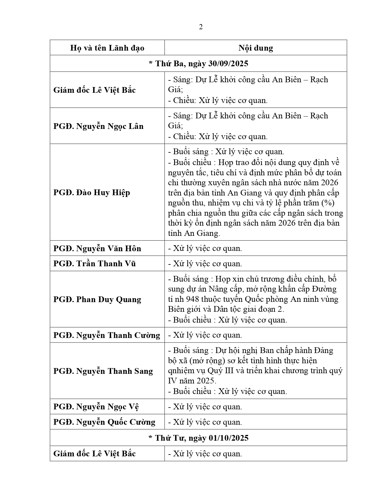 Lịch làm việc của Lãnh đạo Sở Xây dựng tỉnh An Giang, từ ngày 29/9/2025 đến ngày 05/10/2025