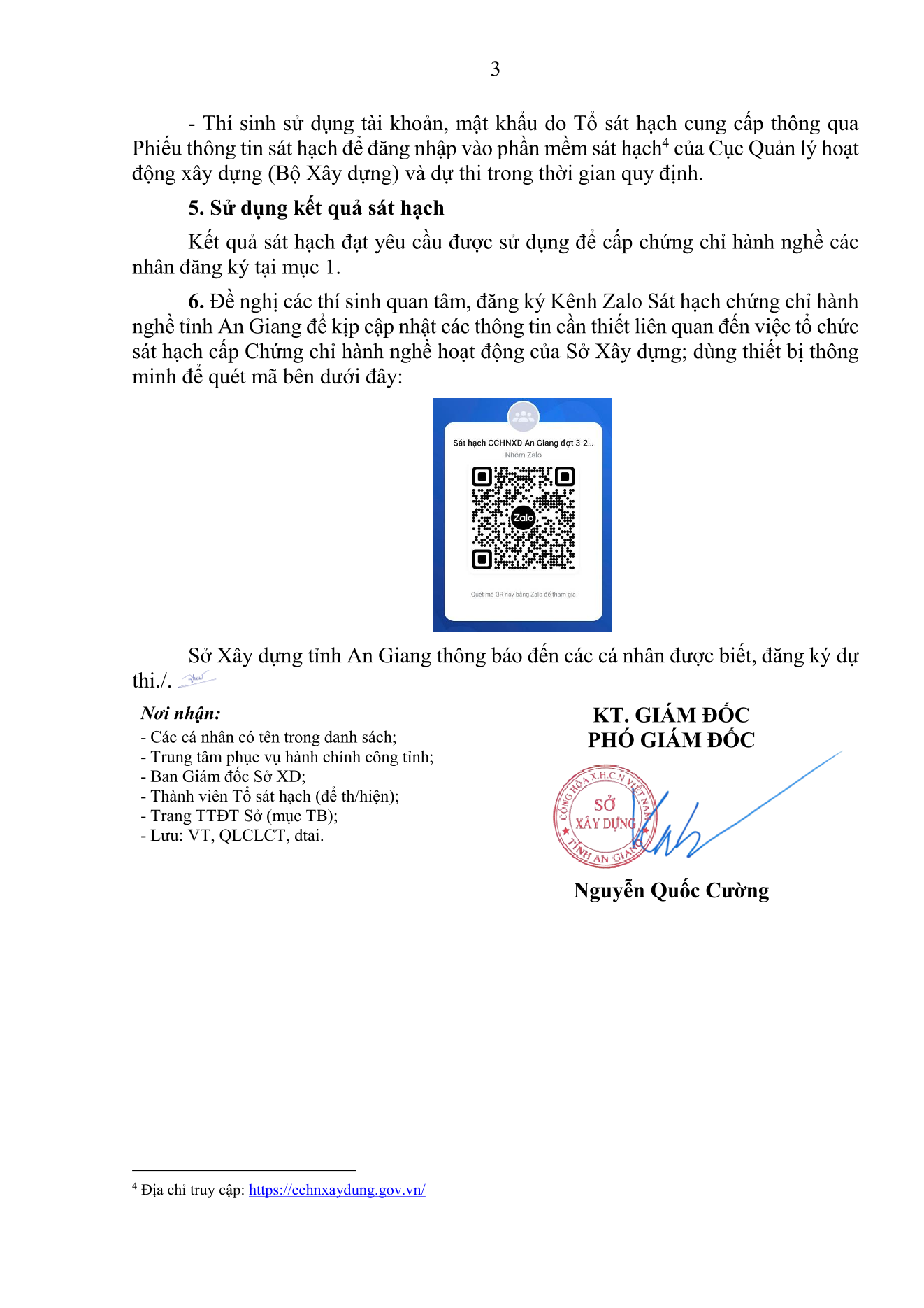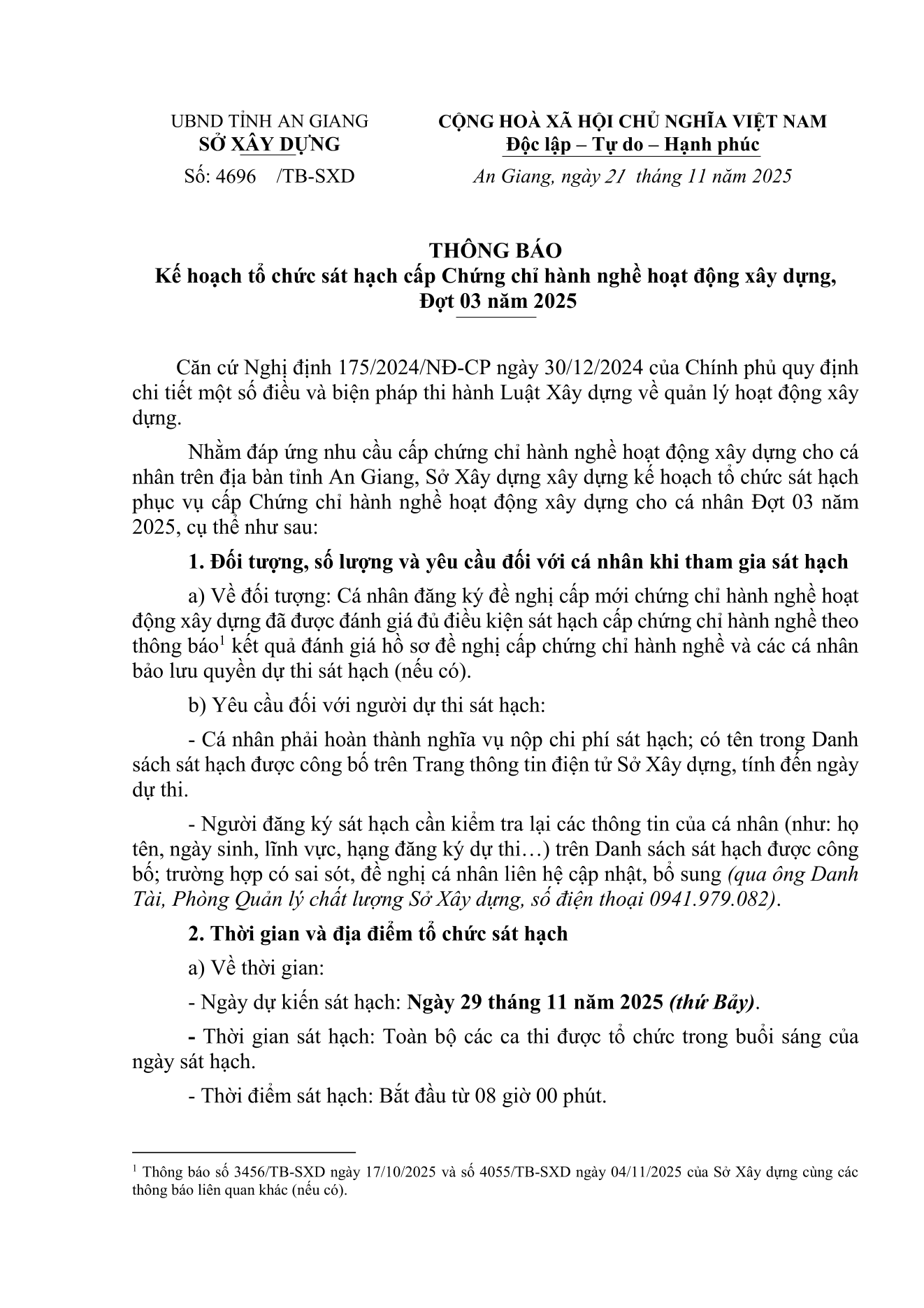 Ngày 21/11/2025, Sở Xây dựng tỉnh An Giang đã có thông báo số 4696/TB-SXD thông báo kế hoạch tổ chức sát hạch cấp Chứng chỉ hành nghề hoạt động xây dựng, Đợt 03 năm 2025