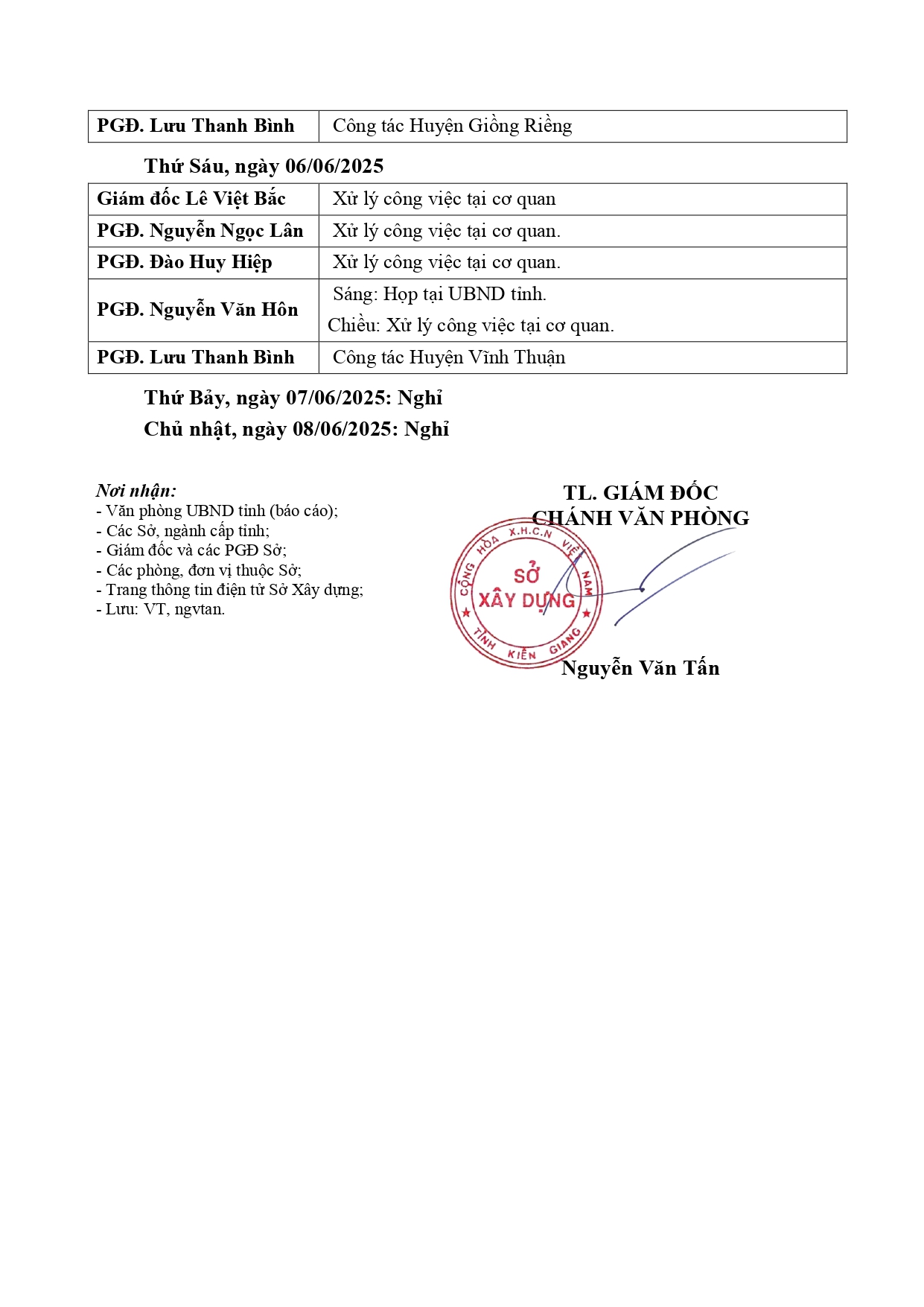 Thông báo lịch làm việc của Lãnh đạo Sở Xây dựng tỉnh Kiên Giang, từ ngày 02/6/2025 đến ngày 08/6/2025