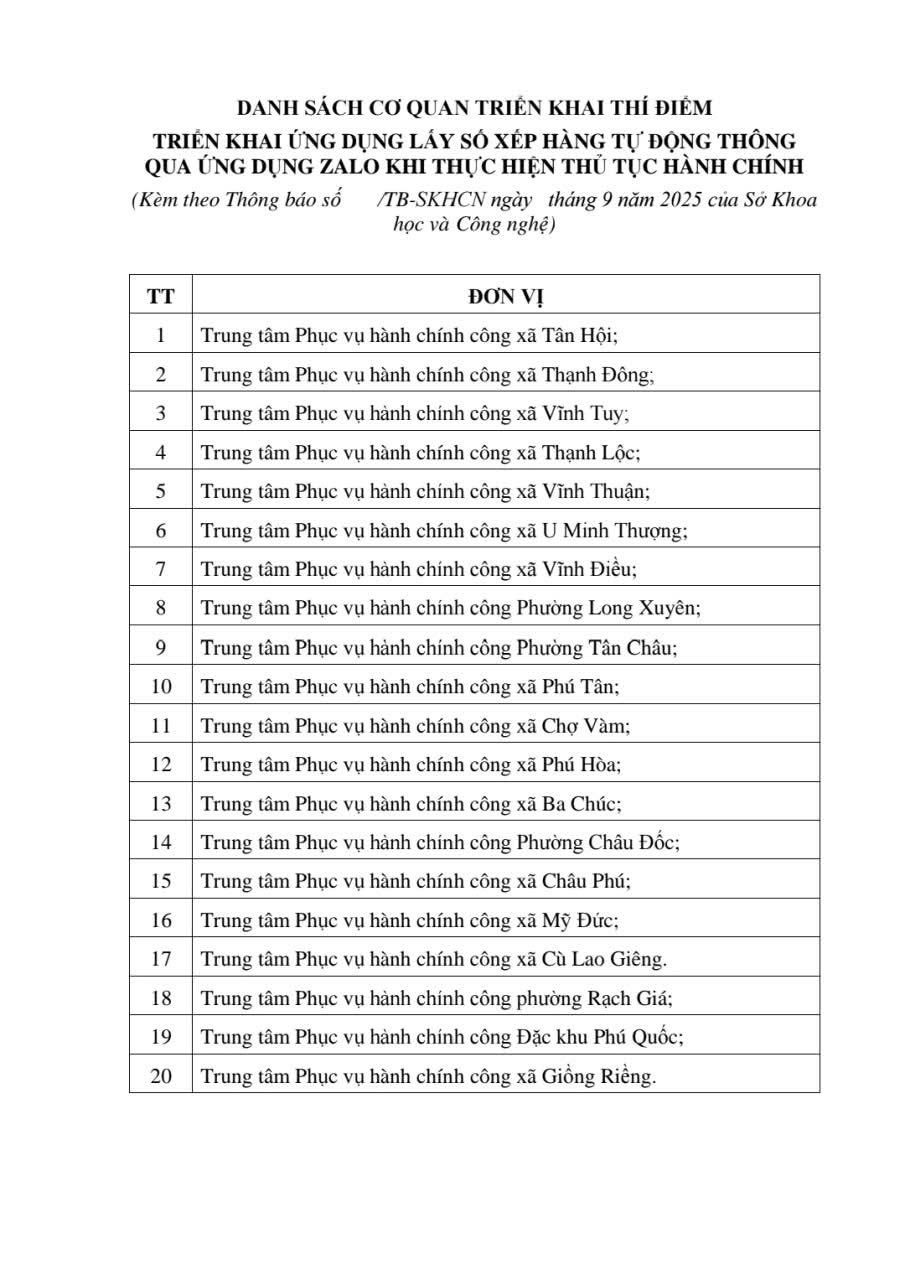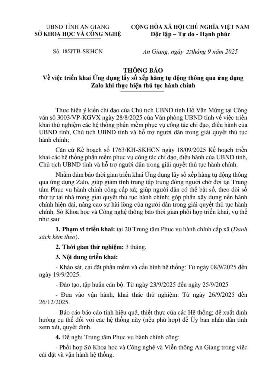 Ngày 22/9/2025, Sở Khoa học và Công nghệ đã có Thông báo số 1853/TB-SKHCN về việc triển khai Ứng dụng lấy số xếp hàng tự động thông qua ứng dụng Zalo khi thực hiện thủ tục hành chính. Sở Xây dựng tỉnh An Giang xin đăng tải toàn bộ Thông báo theo tệp kèm theo.